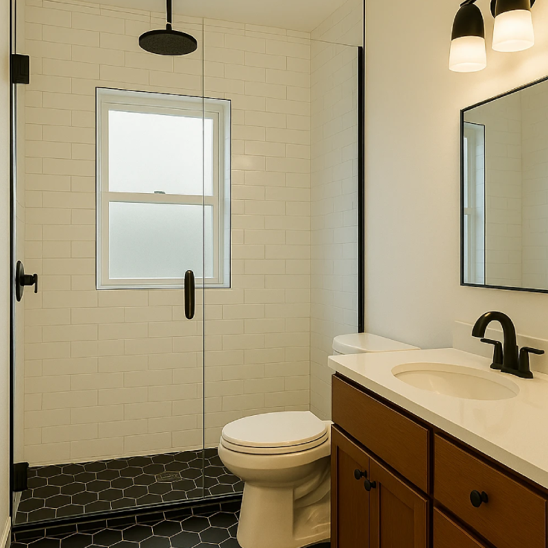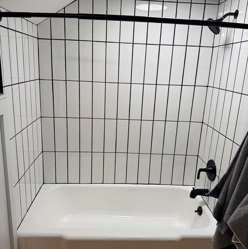 This modern bathroom remodel features bold black and white tile, matte black fixtures, and warm wood-tone flooring for a clean, contemporary look. Custom board and batten walls and high-contrast finishes deliver a sleek, design-forward space.
