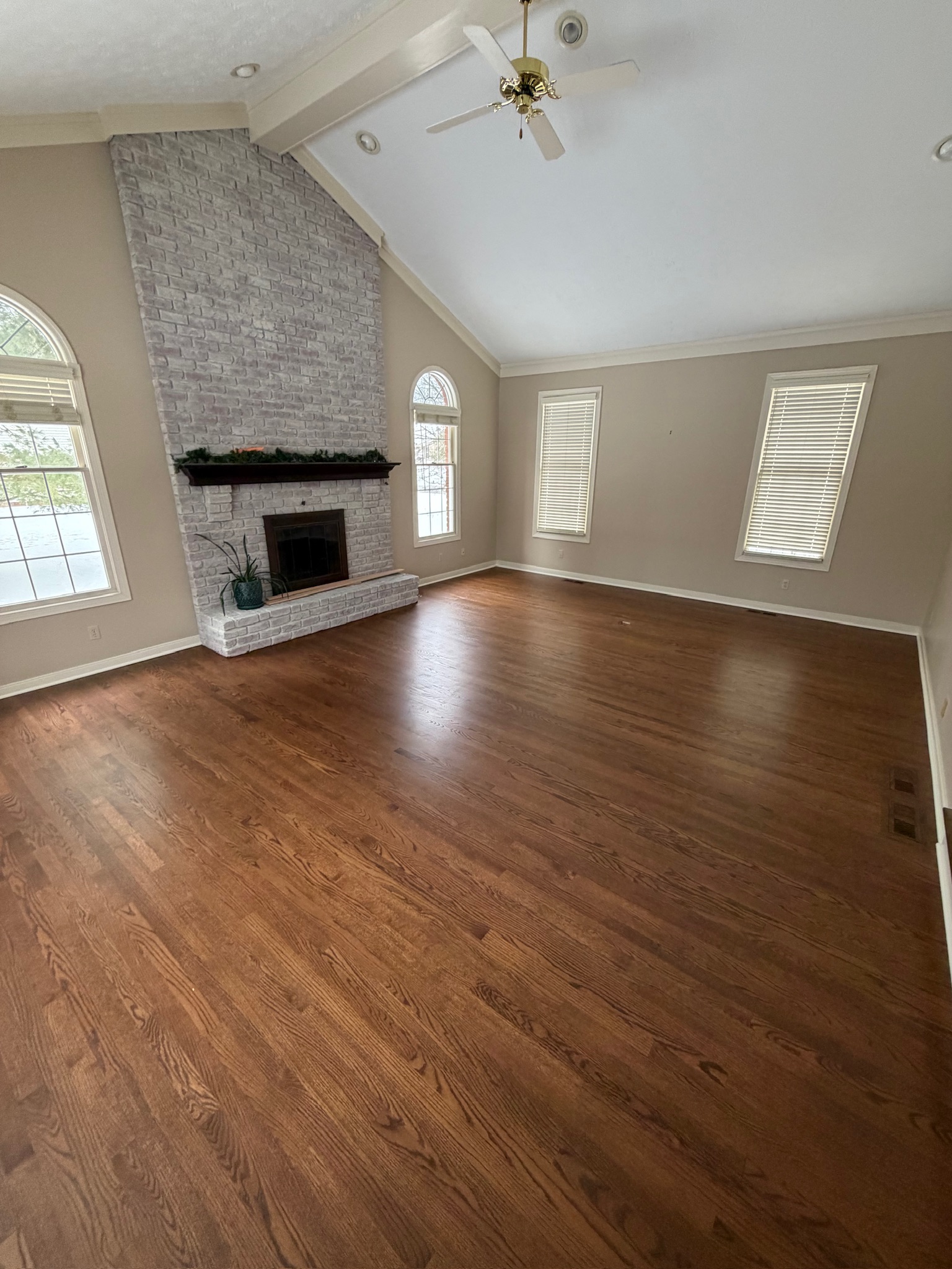 Removed the entire first floor of a homes outdated carpet and replaced it with a custom stained hardwood floor.