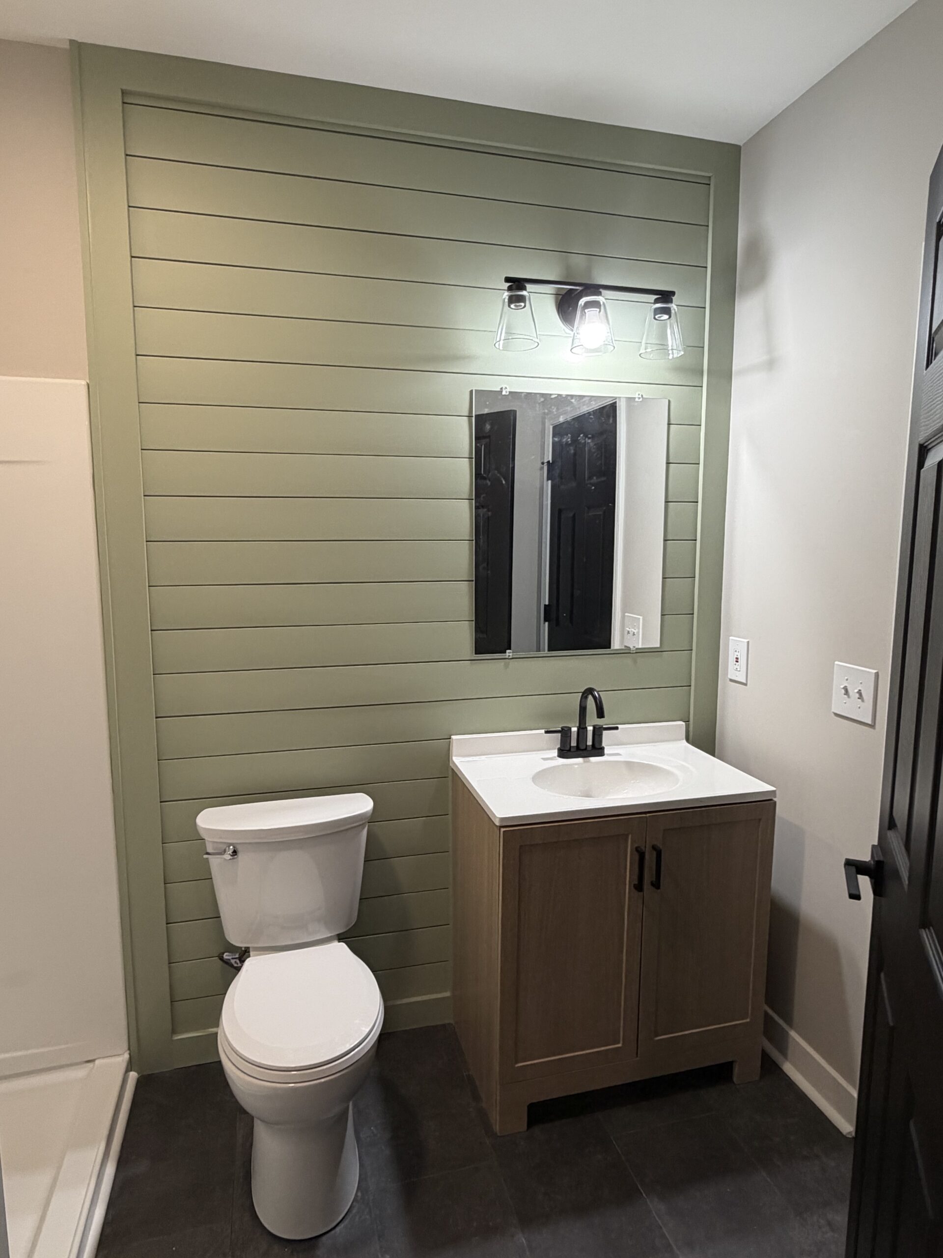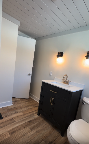 This basement remodel now features a private bedroom, full bathroom, and beautifully finished living space — designed to feel like a natural extension of the home.